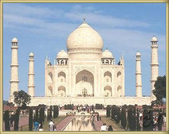 Copyright 2000 Noreen Majeed The Taj MahalThe most beautiful building in the world. In 1631 the emperor Shah Jahan built the Taj Mahal in memory of his wife Mumtaz, who died in childbirth. The white marble mausoleum at Agra has become the monument of a man's love for a woman. Shah Jahan came to power in 1622 when he seized the throne from his father, while murdering his brothers to ensure his claim to rule. He was known as an extravagant and cruel leader. But he redeemed himself by his generosity to his friends and the poor, by his passion in adorning India with some of its most beautiful architecture, and by his devotion to his wife Mumtaz Mahal - "Ornament of the Palace." He had married her when he was 21, when he already had two children by an earlier consort. Mumtaz gave her husband 14 children in eighteen years, and died at the age of 39 during the birth of the final child. Shah Jahan built the Taj Mahal as a monument to her memory and her fertility, but then relapsed into a life of scandalous behavior. This tomb was only one of hundreds of beautiful buildings that Shah Jahan erected, mostly at Agra and in the new Dehli that came into being under his planning. Many architects have rated it as the most perfect of all buildings standing on earth. Three artists designed it: a Persian, an Italian, and a Frenchman. But the design is completely Mohammedan. Even the skilled artisans who built it were brought in from Baghdad, Constantinople, and other centers of the Muslim faith. For 22 years more than 20,000 workmen were forced to build the Taj. The Maharaja of Jaipur sent the marble as a gift to Shah Jahan. The building and its surroundings cost more than $200,000,000 in todays currency. Passing through a high wall, one comes suddently upon the Taj - raised upon a marble platform, and framed on either side by handsome mosques and stately minarets. In the foreground spacious gardens enclose a pool in whose waters the inverted palace becomes a quivering dream. Every portion of the structure is of white marble, precious metals, or costly stones. The building is a complex figure of twelve sides, four of which are portals. A slender minaret rises at each corner, and the roof is a massive spired dome. The main entrance, once guarded with solid silver gates, is a maze of marble embroidery; inlaid in the wall in jeweled script are qotations from the Koran, one of which invites the "pure in heart" to enter "the gardens of Paradise." Shah Jahan had begun his reign by killing his brothers; but he had neglected to kill his sons, one of whom was destined to overthrow him. In 1657 his son Aurangzeb led an insurrection from the Deccan. Aurangzeb defeated all the forces sent against him, captured his father, and imprisoned him in the Fort of Agra. For 9 bitter years the deposed emperor lingered there, never visited by his son, attended only by his faithful daughter Jahanara, and spending his days looking from the Jasmine Tower of his prison across the Jumna to where his once-beloved Mumtaz lay in her jeweled tomb. The new emperor Aurangzeb was a more pious Muslim than his father Shah Jahan had been. He memorized the entire Koran, spent days in fasts, and campaigned against infidelity. He cared little for luxuries, but, paradoxically, gave the world one of its most perfect works of art: a marble screen inside the Taj Mahal. Native and European thieves robbed the tomb of its abundant jewels, and of the gold railing, encrusted with precious stones, that once enclosed the sarcophagi of Shah Jahan and his Queen. Aurangzeb replaced the railing with an octagonal screen of almost transparent marble, carved into a miracle of alabaster lace. Few products of human art have ever surpassed the beauty of this screen. From afar the Taj Mahal, with its delicate details, is not imposing. Only a nearer view reveals that its perfection has no proportion to its size. When in our hurried times, we see enormous structures of a hundred stories raised in a year, and then consider how 20,000 men worked for 22 years on this little tomb, hardly a hundred feet high, we begin to sense the difference between industry and art. And perhaps more importantly, we sense the ultimate lesson it offers: beauty and that which lasts, is based on love. Adapted from: Our Oriental Heritage, Will Durant, Simon and Schuster, 1954 More photos: